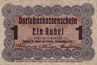 Ostrubel (German and Polish: Ostrubel; Latvian and Lithuanian: Ostrublis; Russian: Острубль) is the name given to a currency denominated in copecks and rubels, which was issued by Germany in 1916 for use in the eastern areas under German occupation (Ober Ost and the Government General of Warsaw). It was initially equal to the Imperial rouble. The reason for the issue was a shortage of currency. The banknotes were produced by the Darlehnskasse in Posen (now Poznań) on 17 April 1916.