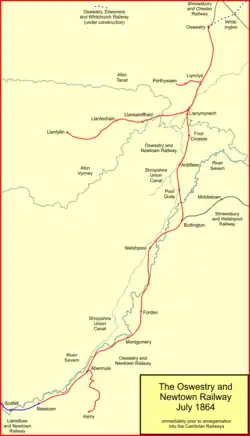 The Shrewsbury and Welshpool Railway (S&WR), sponsored at first by the LNWR, was opened throughout on 27 January 1862. This formed a shorter route from Newtown to the Midlands and London, and abstracted traffic from the O&NR. The S&WR was worked by the LNWR, and the GWR had running powers; in 1865 the two larger companies took ownership control of the line jointly.[1]: 35–40