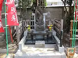 She was a humble maidservant of the Sakuma family in Odenma-cho in Edo, who lived during the 17th century. She was a very religious woman of great Buddhist virtue. She gave all she had to the poor, ate hardly any food, and performed the most menial chores with extreme diligence.[1] A group of mountain ascetics, who were searching for the reincarnation of the Nyorai Buddha, found her. When Otake bent down to pick up a few grains of rice that had fallen on the floor, a halo-like light surrounded her, convincing the ascetics that they had come upon a divine being. Otake is often portrayed with an object behind her head that resembles a halo, or with a shadow or reflection identifying her as a buddha.[2]