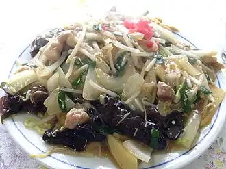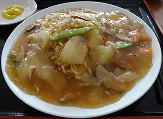 Otaru Ankake Yakisoba is not just served at Chinese restaurants, but also such places as ramen restaurants,[10] diners, Cafeterias,[11] Western-style restaurants,[12] cafes,[13] Izakaya, Hotels, bathhouses,[14] mahjong parlours,[15] Ski resorts[16] and golf pavilions. The fact that it is a popular item on the menu at each restaurant could also be considered a characteristic of the dish. The number of restaurants serving the dish is said to be close to 100[17] It is also said that in Otaru 'yakisoba' more often refers to ankake yakisoba than to regular yakisoba.[18][19]