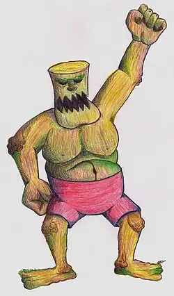 A similar Russian tale is called "The Clay-Boy" ("Гли́няный па́рень", Glínyanyĭ párenʹ). In it, an old childless couple make themselves a clay-child, who first eats all their food, then them, then a number of people, until he meets a goat who offers to jump right into his mouth, but instead uses the opportunity to ram the Clay-Boy, shattering him and freeing everyone.