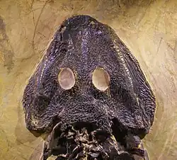 The notches have been interpreted as part of an auditory structure and are often reconstructed as holding a tympanum similar to those seen in modern anurans. Analysis of the columella (the stapes in amphibians and reptiles) of labyrinthodonts however indicates that it did not function in transmitting low-energy vibrations, thus rendering these animals effectively deaf to airborne sound.[1] The otic notch instead functioned as a spiracle, at least in the early forms.[2]