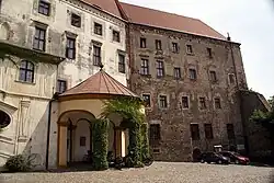 The first known mentioning of Otmuchów comes from 1155, however, it certainly existed, along with the castle, already in the 11th century. It was a seat of a castellany within medieval Poland ruled by the Piast dynasty.[4] It was a property of the Diocese of Wrocław and a result of the fragmentation of Poland, it formed part of the Duchy of Nysa. In the 14th century the city was surrounded by defensive walls. Establishment of the coat of arms of the city dates back to 1347, when Bishop of Wrocław Przecław of Pogorzela vested Otmuchów with town rights.[4] The coat of arms is an open city gate in white on a blue field. From the 14th century it was used as the town seal. Destroyed by many wars throughout history, the town lost its importance due to a nearby developing city of Nysa, which was the capital of the principality of the bishop. In 1428, 1430 and 1443 the town was captured by the Hussites.[4] In the 15th century conflicts occurred between indigenous Poles and German settlers.[4] Germans tried to oust the Polish language from local churches.[4] Local Polish church superior lodged a complaint against a German priest who threatened to expel Poles from the church.[4]