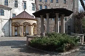 After the secularisation in 1810, the castle was left in ruins, while the lands were given off to the powerful House of Humboldt; the Duke of Humboldt used the material from the former, other two wings to repair the currently standing reconstructed wings. In the location of the former wings, the owner built a small castle-garden, while his brother Alexander von Humboldt sent in exotic trees, such as the smoketree, ginkgo, or the Canadian lime tree. One of the most unusual parts of the residence's interior is located in the castle's two small cells of death, where prisoners were told to enter, and fall down a 20-metre drop, where there is a scripture Go you are free (Idź jesteś wolny, Polish); the sudden drop let to the stone courtyard with a sharpened birch perch.[3]