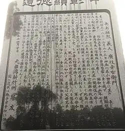Subsequently, Hiroeda served as head of the Zhunan local government. As the Pacific War escalated, Hiroeda was ordered to assume command of a naval patrol squadron, which consisted of 2000 Taiwanese soldiers.[4] In 1943, Hiroeda and his squadron boarded a refitted merchant ship (the Busho Maru) at Takao, and were transported to Cavite on Luzon island in the Philippines.[5] In February 1945, the United States Army reached the outskirts of Manila. The encircled Japanese forces were slowly forced to retreat, and Hiroeda was ordered to supply the Taiwanese soldiers under his command with sticks attached to warheads, for use in suicide charges against enemy tanks. However, Hiroeda refused to carry out his orders, and together with his Taiwanese sergeant, Liu Wei-tian (Chinese: 劉維添; pinyin: Liú Wéitiān; 1922–2013), entered secret negotiations with the US forces. In the afternoon of February 23, Hiroeda ordered the soldiers under his command to surrender to the US forces, saying, "You are Taiwanese and no doubt have wives, parents, and siblings waiting for you at home. It is unfortunate we cannot return together, but you men at least should return home alive. I am Japanese, and therefore I alone am responsible for this".[6] Hiroeda then committed suicide by shooting himself. He was 40 years old.[7]