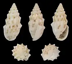 The white shell is covered with spiral rows of chestnut spots. The whorls of the teleoconch are angulated above, with longitudinal ribs produced into nodules at the angles. The lower part of body whorl is pitted, forming a sort of network between the pits. The length of the shell varies between 11 mm and 25 mm.[3]