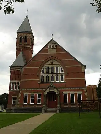 Otsego County Courthouse is a historic courthouse building in Cooperstown, Otsego County, New York. It is a 2+1⁄2-story, brick-and-stone structure on a foundation of coursed ashlar. It was designed by Archimedes Russell (1840–1915) and built in 1880. It features a gable roof, projecting pavilions, and a tower with supporting pavilion and overhanging top stage. The front facade of the building is dominated by a large stained glass window.[2]