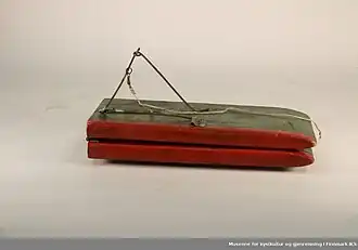 The otter may have multiple different designs. Otter boards used in bottom trawling are based on a similar design principle. The design takes advantage of the shearing effect achieved when the board is positioned at an oblique angle to the current. The effect is reminiscent of that of a kite in the wind.[2][1] Different designs are found in Switzerland, the Nordic countries, California and Japan. Most commonly, the traditional board was made of wood and had a length about 2 ft (0.61 m), a width of 6 in (15 cm), and a width of less than 1 in (2.5 cm). To enable it to float in an upright position, it was equipped with metal weights made of lead or iron.[3] The correct amount of weights allows the board to float with only 1–2 in (2.5–5.1 cm) above the surface. Snells, baited with flies or spoons are placed at intervals along the line. The snells would have different lengths due to the height above the water of the line along its length: 1 in (2.5 cm) adjacent to the board and hip-height adjacent to the fisherman.[3]