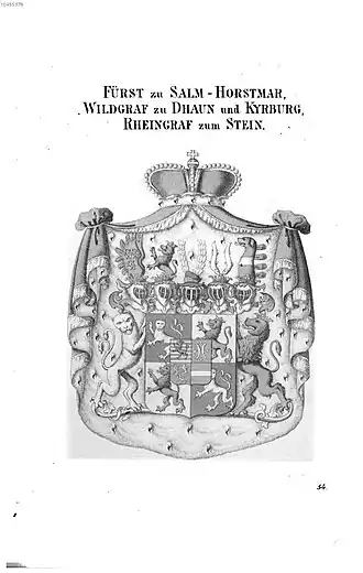 - ^ The Principality of Salm-Horstmar was a short-lived Napoleonic County in far northern North Rhine-Westphalia, Germany, located around Horstmar, to the northeast of Münster. It was created in 1803 for his father, Wild- and Rhinegrave Friedrich of Salm-Grumbach, following the loss of Grumbach and other territories west of the Rhine to France. The county was mediatised to the Kingdom of Prussia in 1813 and the Wild- and Rhinegrave was awarded a princely title within the Kingdom of Prussia three years later, on 22 November 1816 by Frederick William III of Prussia.[2]