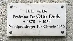 Otto Paul Hermann Diels (German pronunciation: [ˈɔto ˈdiːls] ⓘ; 23 January 1876 – 7 March 1954) was a German chemist. His most notable work was done with Kurt Alder on the Diels–Alder reaction, a method for cyclohexene synthesis.[1] The pair was awarded the Nobel Prize in Chemistry in 1950 for their work. Their method of synthesizing cyclic organic compounds proved valuable for the manufacture of synthetic rubber and plastic.[2] He completed his education at the University of Berlin, where he later worked. Diels was employed at the University of Kiel when he completed his Nobel Prize-winning work, and remained there until he retired in 1945. Diels was married, with five children. He died in 1954.