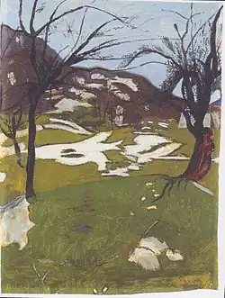Otto Meyer renamed himself Meyer-Amden after having experienced such a profound connection to the village he'd lived in. He left behind around 500 paintings and drawings; abstract figure paintings with expressive and religious elements, scenes depicting youths at boarding schools, street scenes in Zürich, and watercolors with symbolic linear compositions. His interest in representing young men is often attributed to his homosexuality.[3] Although he never made a living from his work, he is now remembered as an important predecessor for abstract painting in Switzerland and for his influence on Oskar Schlemmer.[4]