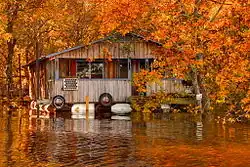 The river continues to be utilized for commercial navigation on a smaller scale than during its "steamboat" days.[18] It is fed by numerous small creeks containing endemic native fish such as killifish. Fishing remains popular in the river for black bass, white bass, bream, freshwater drum, and gar. Concerns about airborne mercury contamination in some areas discourage consumption of the fish for food. Fishing for rainbow trout is popular in the tailwaters of Lakes Ouachita, Hamilton and Catherine in and around Hot Springs, Arkansas.
