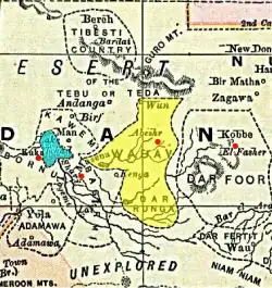 Founded by the Tunjur people in the 16th century[1] and located in the eastern Chad Basin, Wadai's economy relied on cattle herding and slave trading. Accordingly, it developed a capable military whose main purpose was to raid other territories for slaves.[1][2][3] Even though Islam served as state religion, traditional religious practices remained common among Wadai's population.[1] Regardless, religion was used to justify slave raids against non-Muslim peoples to the south.[4] In the 19th century, Wadai grew in power thanks to a succession of capable kings (kolak), despite occasional civil wars.[1][4] The state eventually forged an alliance with the influential Senussi order which was based in the desert to the north and controlled important Trans-Saharan trade routes,[1] becoming the dominant power in the east-central Chad Basin.[4] Wadai prospered under the stable reigns of Ali ibn Muhammad Sharif (r. 1858–1874) and Yusuf ibn Muhammad Sharif (r. 1874–1898).[1] Caravans increasingly opted to travel through Wadai, deeming it safer, and brought the region much wealth. Relying on its prospering economy and firearms imported from the Senussi, Wadai expanded and subjugated several other polities such as Bornu[1] and the Sultanate of Bagirmi, forcing them to pay tribute[2][5] and abducting skilled craftsmen to enrich the empire.[6]