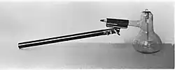 An Oudin coil, also called an Oudin oscillator or Oudin resonator, is a resonant transformer circuit that generates very high voltage, high frequency alternating current (AC) electricity at low current levels,[1][2][3] used in the obsolete forms of electrotherapy around the turn of the 20th century.[4] It is very similar to the Tesla coil, with the difference being that the Oudin coil was connected as an autotransformer.[2][5] It was invented in 1893 by French physician Paul Marie Oudin[6] as a modification of physician Jacques Arsene d'Arsonval's electrotherapy equipment[7][8] and used in medical diathermy therapy as well as quack medicine[9][10] until perhaps 1940. The high voltage output terminal of the coil was connected to an insulated handheld electrode which produced luminous brush discharges, which were applied to the patient's body to treat various medical conditions in electrotherapy.[4]