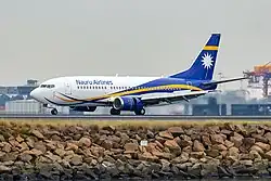 In March 2006, the government of the Republic of China, reportedly as a reward for Nauru's diplomatic recognition of the ROC instead of the People's Republic of China,[29] assisted Air Nauru with the purchase of a second-hand Boeing 737, which was expected to be in operation by mid-2006, after several logistical delays. This purchase was put on hold in May 2006 due to OzJet and Air Pacific (now Fiji Airways) having started on the routes formerly operated by Air Nauru.[30] In October 2006 the new Boeing plane came into service. The plane was registered as VH-INU and named as 'Naoero'. In 2008, the Airline bought their second Boeing 737-300 adorned with a full Norfolk Air livery, remaining till now despite Norfolk Air's current state of closure. The plane was registered as VH-NLK. Later in March 2013, the Airline purchased a Boeing 737-300 from GECAS. The plane was painted in the 'Our Airline' livery in Melbourne, making its first visit to Brisbane Airport on 3 September 2013.[31]