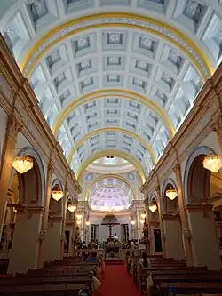The original chapel was painted white in colour both from the inside and the outside, giving the name White Chapel. A special mixture of paint, egg and limestone were used to paint the walls. The colours of the exterior were changed during 1900s and interiors during the 2000s.[3] The bells in the temple are believed to have been procured from France. The bell had a complex mechanism with pulleys and ropes connected to a rope all the way downstairs. During 2012, after a renovation of the chapel, the operation of the bell has been suspended on account of vibrational effects causing hindrance to neighbouring structure.[4] The temple is locally called Dumas Church since it is located in Dumas Street in White Town.[1]