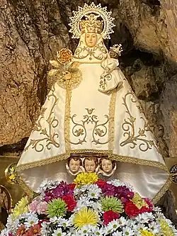 Our Lady of Covadonga (Asturian: Virxen de Cuadonga) also named "La Santina" is a title of the Blessed Virgin Mary and the name of a Marian shrine devoted to her at Covadonga, Asturias. The shrine in northwestern Spain rose to prominence following the Battle of Covadonga in about 720, which was the first defeat of the Moors during their invasion of Spain. A statue of the Virgin Mary, hidden in one of the caves, was believed to have miraculously aided the Christian victory.