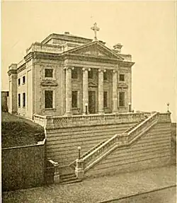 The parish was founded by Dona Manuela de Laverrerie de Barril, the wife of the Spanish Consul-General in New York.[2][5] Archer Milton Huntington, the railroad heir and founder of the Hispanic Society of America, was recruited to the cause and funded the project for the second Spanish-speaking Catholic church in New York. The church building was begun in 1909 to designs by Archer's cousin, Charles P. Huntington.[1] The building was enlarged and extended in 1924 by Lawrence G. White, son of Stanford White,[2] including an addition on 156th Street. Previously, the entrance to the church, which sat on a hill, was by way of an outdoor brick stairway with terra cotta balustrades, but White's addition allowed for an entrance at the street level, with the climb to the church occurring via an indoor staircase.[4]