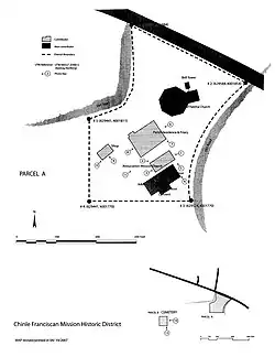 The Chinle Franciscan Mission Historic District is located in Chinle, Arizona, one of the population centers on the Navajo Nation. It is on the west side of the main east–west route through Chinle, Indian Service Route 7. The 2.92-acre site is approximately 2 miles west of Canyon de Chelly National Monument, and is the core of a larger 160-acre parcel which is in held in trust by the U.S. Federal Government for the Navajos. It was originally set aside for the Franciscan Friars in 1903, and is now leased by the Roman Catholic Church, through the Diocese of Gallup, New Mexico. It includes the Our Lady of Fatima Church. The entirety of the historic district is defined by three historic buildings, one historic object and one historic site. The buildings were constructed between 1905 and 1925 and are the Friary, the Annunciation Mission Church, and the Workshop/Garage; the object is the church bell, which was cast in 1914; and the site is the church's cemetery, which was active between 1907 and 1935. The district is made up of two discontiguous parcels. The first parcel is 2.2 acres and contains the Friary, Church, Garage and Bell, while the second parcel is .72 acres and contains the cemetery.[2]: 42