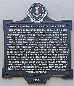 The image was brought to the country by governor-general Juan Niño de Tabora from Mexico via the galleon El Almirante in 1626. His safe voyage across the Pacific Ocean was attributed to the image, which was given the title of "Our Lady of Peace and Good Voyage". It was substantiated later by six other successful voyages of the Manila-Acapulco Galleons with the image aboard as its patroness.[1][2]