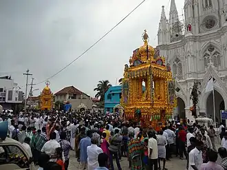 The culmination of the feast is the golden chariot procession: two golden chariots are taken on the 9th and 10th days of the feasts. Our Lady of Delight is taken in procession in the 1st chariot, which was made in 1798. St. Joseph, the spouse of Mary, is taken in procession in the 2nd chariot, which was made in 1833. During the golden chariot procession, the traditional Nathaswaram music and peculiar praising of Mother Mary by an art of pala padal can be heard and seen. Pilgrims from different parts of the country visit the church during the annual feast.