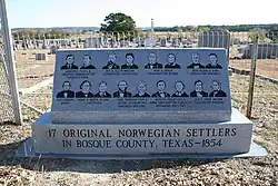 The area around the communities of Norse, Clifton, and Cranfills Gap is known as the Norse Historical District. Recently a monument was constructed just outside the church's cemetery recognizing the 17 original Norwegian settlers of Bosque County.[4][5][6]