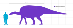 Ouranosaurus was a relatively large iguanodontian, measuring 7–8.3 metres (23–27 feet) long and weighing 2.2 tonnes (2.4 short tons).[1][4] The holotype and paratype specimens were suggested to belong to subadults by Bertozzo et al. in 2017, although they would have been close to adult size. MSNVE 3714 is 6.5 m (21 ft) long as mounted, although a few caudals are missing, and is roughly 90% the length of the holotype, which would be 7.22 m (23.7 ft) long. The variation between the sizes fits within the range of variation between adult individuals of Iguanodon, so there is a chance that the larger holotype and smaller paratype were in the same ontogenetic stage.[3]