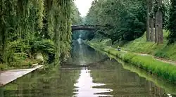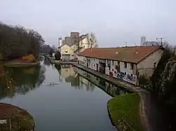 The Canal de l'Ourcq (French pronunciation: [kanal də luʁk]) is a 108.1 km (67.2 mi) long canal in the Île-de-France region (greater Paris) with 10 locks.[1] It was built at a width of 3.20 m (10.5 ft) but was enlarged to 3.7 m (12 ft), which permitted use by more pleasure boats.[1] The canal begins at Port-aux-Perches near the village of Troesnes, where it splits from the channeled river Ourcq, and flows to the Bassin de la Villette, where it joins the Canal Saint-Martin. Paris requires 380,000 cubic metres (84,000,000 imp gal; 100,000,000 US gal) of water daily for cleaning the sewer system, gutters, and parks.[1] The Canal de l'Ourcq provides about half of the requirement. Since 1983, the waterway has been designated for use by pleasure craft, and its water is designated for non-drinking uses.[2]