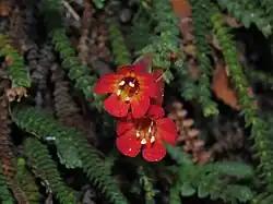 Ourisia polyantha can be distinguished from O. microphylla by red corollas that are yellow inside the tube and longer than 15 mm (vs. pink or white corollas that are less than 15 mm long) and its long stamens over 16 mm long, with filaments attached near the tube opening (vs. short stamens less than 5 mm long, with filaments attached half-way down the corolla tube).[3]