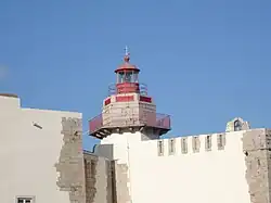 The lighthouse was originally installed in 1775 higher up in the Serra da Arrábida (Arrábida hills) than its present position. Little is known about the early lighting system but it is likely to have made use of Argand lamps, which were invented in 1780. In 1857 it underwent some modifications, among them the substitution of the catoptric system with the second Fresnel lens to be installed in Portugal. In 1863 it was transferred to the fort of Santiago do Outão, which since 1909 has also housed an Orthopedic hospital. The light is mounted on a hexagonal tower that has a double balcony. Part of the tower is now painted white, with the top being in stone.[3][4]