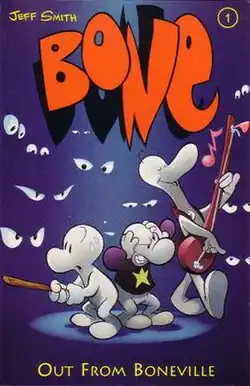 Out From Boneville is the first story-arc in the Bone series. It collects the first six issues of Jeff Smith's self-published Bone comics. It marks the beginning of part one (of three) of the Bone series, titled Vernal Equinox. The book was first published by Cartoon Books in its original black-and-white version in 1995; excerpts were printed in Disney Adventures over the course of 1994–1998. Paperback and hardback colored editions were published in 2005 by Scholastic.
