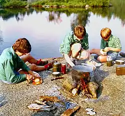 Backwoods cooking is widely practiced within the Scouting movement. While it is most associated with scouting today, the term "backwoods cooking" pre-dates Scouting by at least 25 years.[9] Within scouting it may also be known as "lightweight cooking," which may also have a focus on using aluminum foil for cookware for much lighter-weight cooking.[10]