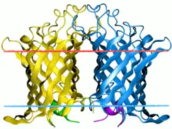 This integral membrane phospholipase was found in many Gram-negative bacteria and has a broad substrate specificity EC 3.1.1.32. The role of OMPLA has been most thoroughly studied in Escherichia coli, where it participates in the secretion of bacteriocins. Bacteriocin release is triggered by a lysis protein (bacteriocin release protein or BRP), followed by a phospholipase dependent accumulation of lysophospholipids and free fatty acids in the outer membrane.[2] The reaction products enhance the permeability of the outer membrane, which allows the semispecific secretion of bacteriocins. One speculative function of OMPLA is related to organic solvent tolerance in bacteria.