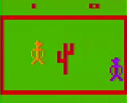 Outlaw[a] is a 1978 shooter video game developed at Atari by David Crane. The game has a Western setting, where one or two players either aim at targets or fellow gunfighters to reach 10 points in a set time. Several modes are available allowing for different obstacles an rules varying how the players move, how their bullets act and how the obstacles block the bullets.