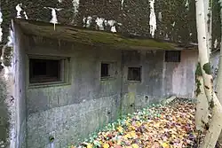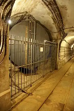 Fermont comprises two entrance blocks, three infantry blocks, three artillery blocks, and one observation block. The combat blocks are connected to the entries and support areas by a gallery system extending over 1,000 metres (3,300 ft) from end to end.[3] The munitions and personnel entries are located far to the rear of the compactly arranged combat blocks, with the entries hidden in the woods. Both entry blocks required elevators to reach the level of the gallery, as the preferred inclined or level tunnel could not be achieved in the local topography.[4] A partial "M1" ammunition magazine is located just inside the ammunition entry, while the underground barracks are located near the junction of the two entry galleries. From there a long, straight gallery runs at an average depth of 30 metres (98 ft) to the combat blocks. Fermont was served by a 60 cm-gauge narrow-gauge railway, which enters at the munitions entrance and runs all the way out through the galleries to the combat blocks. On the surface, the railway connects to supply points to the rear and to other ouvrages.