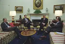 View from above: President George W. Bush seated at lower left holds meeting. -