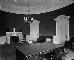 President William Howard Taft made the West Wing a permanent building, doubling its size by expanding it southward, and building the first Oval Office.[13] Designed by Nathan C. Wyeth and completed in 1909, the office was centered on the building's south facade, much as the oval rooms in the White House are. Taft wanted to be more involved with the day-to-day operation of his presidency, and intended the office to be the hub of his administration. The Taft Oval Office had ample natural light from its three windows and skylight. It featured a white marble mantel, simple Georgian Revival woodwork, and twin glass-doored bookcases. It also was likely the most colorful presidential office in history; its walls were covered with vibrant seagrass green burlap.[14]