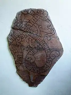 Gästrikland Runic Inscription 15 or Gs 15 is the Rundata designation for a damaged sandstone runestone measuring 1.3 by 1.0 meters that was also found in the eastern wall of the church near the nave. The inscription is classified as being carved in runestone style Pr2, which is also known as Ringerike style. The serpent heads in Pr2 inscriptions are more stylized than those classified as Pr1. The runes on Gs 15 are intricately carved as looped pieces of string that have been described by Swedish runologists as knutrunor or "knot runes." This is the only Viking Age inscription that uses knot runes, but two inscriptions from Greenland, GR 64 from Narsarsuaq and GR NOR1999;7 from Sandet, and a stick from Bergen which are all dated from the Medieval period also use knot runes.[4]