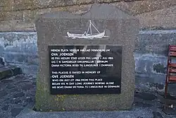 The civic festival Ovastevna is held each August on Nólsoy to commemorate Ove Joensen. His boat Diana Victoria is preserved in Nólsoy in the basement of the café and Tourist Information Centre, near the ferry port.[1][2] There is also a monument to him next to the whale bones that form an ornamental entrance to the village, and another in the village of Aith, Shetland Isles. Joensen is buried in the cemetery of Nólsoy, overlooking the sea.[1]
