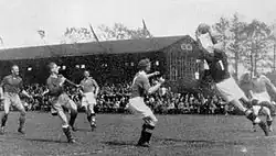 ![]() Ove Nilsson Halmstads BK intervenes in an Allsvenskan match against Hälsingborgs IF at Örjans vall in Halmstad. | |||