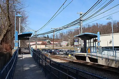 Overbrook Junction was built as part of the 2004 reopening of the Overbrook line.[2] It is the transfer point between the Beechview (serving Castle Shannon, Mt. Lebanon, Dormont, and Beechview) and Overbrook (serving Overbrook, Carrick, Bon Air, and Belzhoover) lines. No parking is available at the site. Since park and ride commuters can more conveniently reach the nearby Castle Shannon station, Overbook Junction almost exclusively serves nearby apartments and individuals switching trains. During peak hours, Red Line trains used to terminate at this station, requiring commuters who need to travel farther south to use the short footpath to Willow.