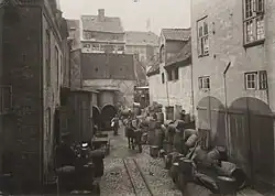 A free-standing 12 and a half bays long and two storeys tall half-timbered house is mentioned in 1730.