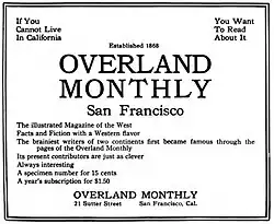 The Overland Monthly was based in San Francisco until at least 1921.[14] In 1923 the magazine merged with Out West to become Overland Monthly and the Out West magazine, and ended publication in July 1935.