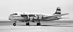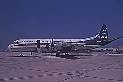 San Francisco-based Air Travel was incorporated in California on May 18, 1946 by George W. Tompkins, a former World War II Navy transport pilot who obtained a war surplus C-54 through preferences for returning veterans.[2] In 1947, Air Travel became Calasia Air Transport.[3] The carrier was issued its "Letter of Registration" on 12 August 1947[4] (in lieu of certificate, as was standard for irregular airlines at the time).[5] Also in 1947, Calasia started operating its fleet of five leased C-54s under contract to Transocean Air Lines until January 1950.[6] In July 1950, Overseas National Airways was incorporated in Delaware,[7] and ONA started operating in the Pacific under contract to the Military Air Transport Service (MATS)[6] (North Korean troops crossed into South Korea on June 25, 1950). In 1954, ONA was an applicant in a CAB case in which Seaboard & Western Airlines was certificated as a scheduled transatlantic cargo carrier. ONA was judged able but not as able as Seaboard,[8] which, based on 1953 data was about three times the size of ONA, whether by fleet (12 DC-4s vs 4) or revenues. ONA's 1953 revenue was 100% military, split 52/48 passenger/cargo.[9]
