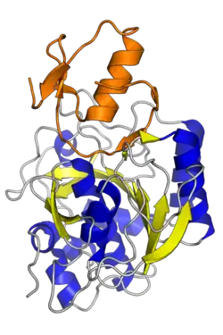 ![]() The third Kazal domain of the turkey ovomucoid protein (orange) bound to subtilisin Carlsberg, a serine protease.[1] | |||||||