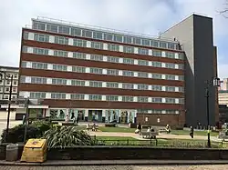 The architectural theme around which most buildings in Coventry's post-war shopping precinct were based was set in 1948 by Donald Gibson's design for Broadgate House. It is a brick-clad building with regularly spaced windows edged with white stone, and an arcade at street level supported by stone-clad columns.[15] The brick chosen is a similar colour to the local red-grey sandstone, allowing the new buildings to sit less jarringly next to the old. Hotel Leofric and the buildings in the Upper Precinct all follow this general pattern with small variations.[16] The Owen Owen Building departed from this theme, its concrete mushroom column construction allowing the creation of a five storey glazed curtain wall facing out onto Broadgate.[17]
