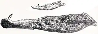The type species of Oweniasuchus is O. major from the Early Cretaceous Upper Purbeck Group in Beccles, England. It is known from a mandibular ramus that was first described as Brachydectes minor by Richard Owen in 1879. Because the generic name Brachydectes was preoccupied by the Carboniferous amphibian Brachydectes, the species was reassigned to the new genus Oweniasuchus by Arthur Smith Woodward in 1885, along with another species, B. minor, also described by Owen from material from Beccles. Recently, O. major has been considered a nomen dubium because the holotype specimen (BMNH 48304) is too fragmentary to provide an adequate diagnosis.[1] O. minor has since been proposed to be a synonym of the atoposaurid Theriosuchus pusillus.[1] Two other species, O. lusitanicus and O. pulchelus, are known from the Late Cretaceous of Portugal.[2]