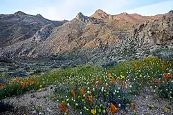 The mountainous terrain has deep, winding, open and expansive canyons, many of which contain springs with extensive riparian vegetation. This area is a transition zone between the Great Basin, Mojave Desert and Sierra Nevada ecoregions. Vegetation varies considerably with a creosote desert scrub community on the bajadas, scattered yuccas, cacti, annuals, cottonwood and oak trees in the canyons and valleys and a juniper-pinyon woodland with sagebrush and digger/gray pine on the upper elevations.