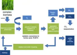 Formic acid is obtained by aqueous catalytic partial oxidation of wet biomass.[1][2][3] A Keggin-type polyoxometalate (H5PV2Mo10O40) is used as the homogeneous catalyst to convert sugars, wood, waste paper or cyanobacteria to formic acid and CO2 as the sole byproduct. Yields of up to 53% formic acid can be achieved.