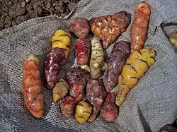 Oca morphotypes are distinguished by foliar, floral, fruit, stem, and tuber characteristics, as described in the International Plant Genetic Resources Institute's document on oca descriptors.[7] The morphological diversity of oca tubers, in particular, is astounding. Tubers range from 25 to 150 mm in length by 25 mm in width;[8] skin and flesh color may be white, cream, yellow, orange, pink, red, and/or purple and distributed in range of patterns.[7]